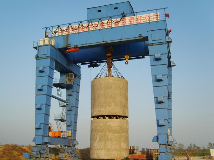 自顶升门式起重机和U型门式起重机类似,门架结构为U型门机,区别在于支腿不同。由于其它工作场合,大型起吊设备无法进场,自顶升门机支腿制作成几段,每段支腿上都有千斤顶顶升支座。小车、主梁端梁组装好后,采用千斤顶顶起,依次将每段支腿用法兰连接到一起。之后安装下横梁、大车运行机构。