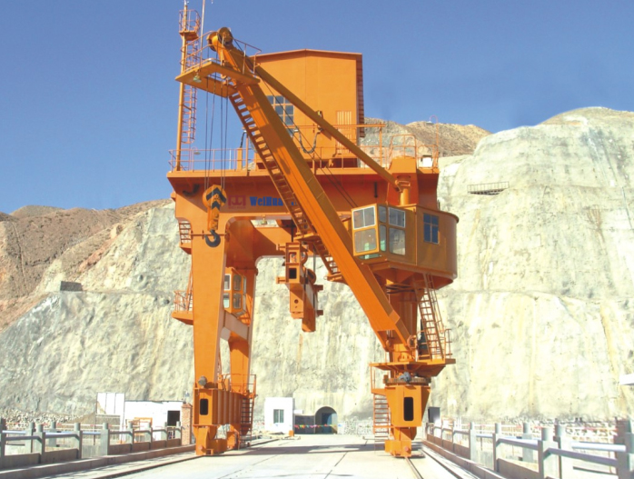 双向双回转门机与双向门机类似。大车沿坝体方向运动,小车沿水流方向运动。一般配有多套抓梁,可对坝上不同中心线上的多孔闸门及拦污栅进行启闭。门机上游或者下游支腿均配有回转吊,每个回转吊回转半径可达180°,可以辅助坝上设备的运输与安装。